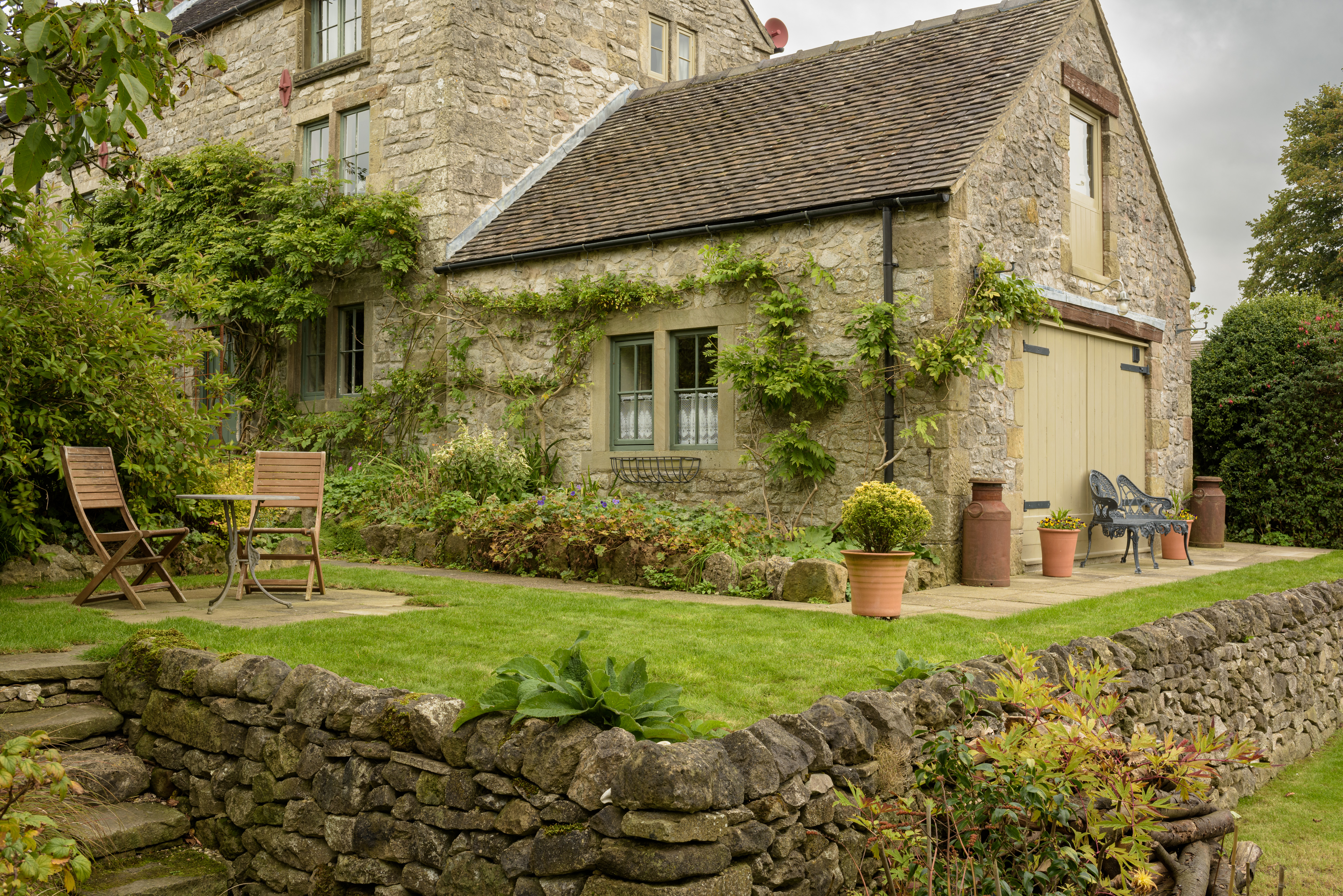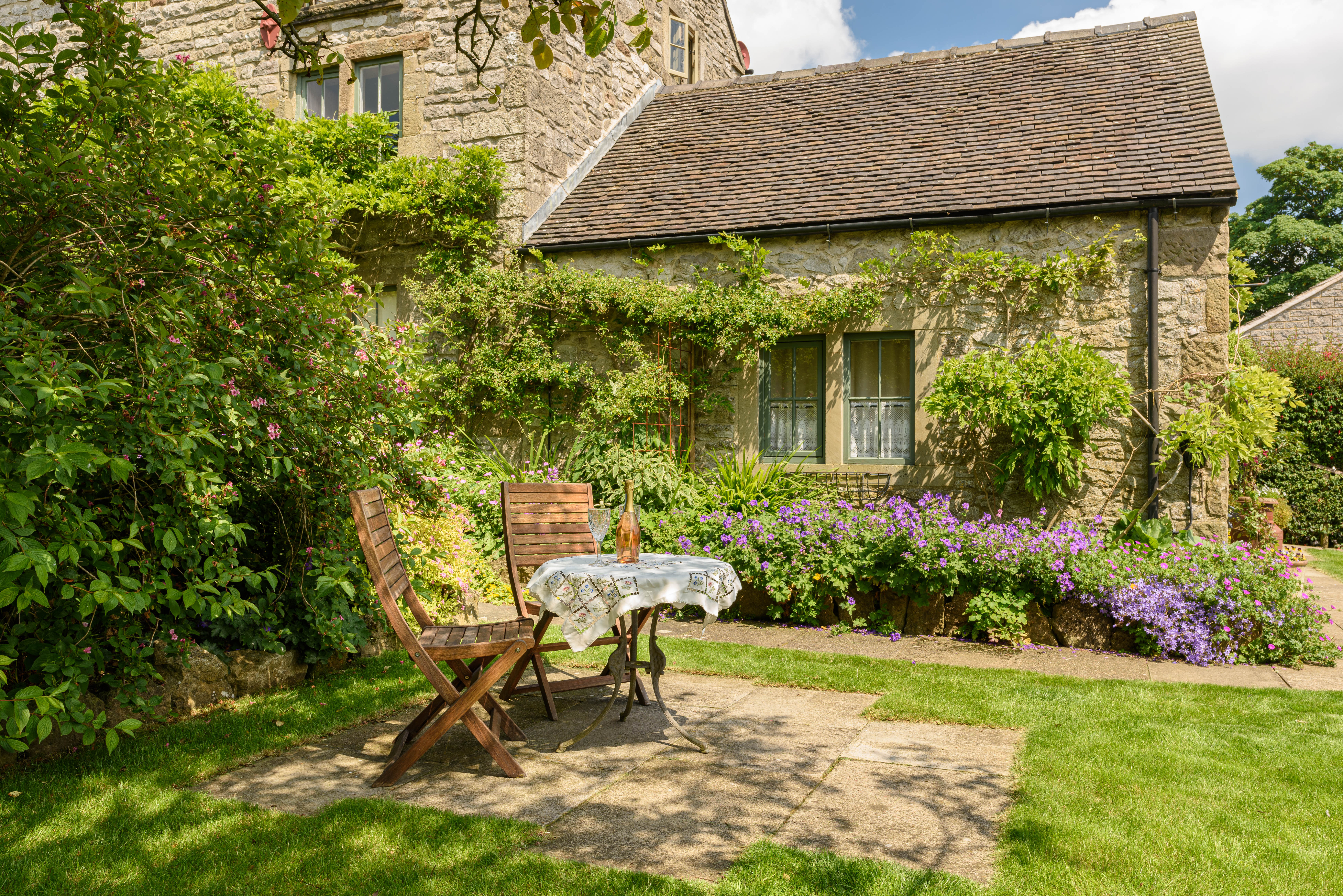 Outside Pail End is a terraced lawn with table and chairs; this area of the owners' garden is enjoyed by guests on fine days.